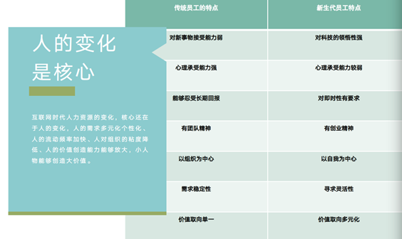 這個(gè)時(shí)代背后的關(guān)鍵變化是人的變化,而人的變化帶來人與組織關(guān)系的變化,它來自于不同時(shí)代人力資源管理理念的變遷。