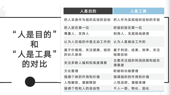 第四個(gè)階段是“人是目的”的提出。這個(gè)理念其實(shí)很早,在一百年前哲學(xué)家康德就提出來了,說人是一切事物的最根本的目的,但是在企業(yè)的應(yīng)用來說,是在互聯(lián)網(wǎng)被普遍應(yīng)用后,旗幟鮮明地提出來的是海爾的張瑞敏先生。