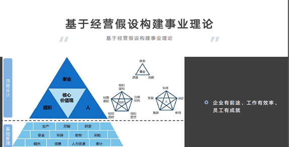 我們的事業(yè)究竟是什么?以使命、愿景、戰(zhàn)略的方式表示出來,回答的是我們的企業(yè)是不是有前途的問題;組織要承接事業(yè)目標(biāo),就要通過組織架構(gòu)、治理結(jié)構(gòu)、管控流程、制度流程提高效率;組織要支撐事業(yè)目標(biāo)實(shí)現(xiàn),需要有催化劑,需要驅(qū)動(dòng)系統(tǒng),驅(qū)動(dòng)系統(tǒng)就是人。怎么樣能夠使人感覺到有成就,愿意從事這個(gè)事情,驅(qū)動(dòng)這個(gè)組織完成事業(yè)愿景。這一系列的思考就叫做經(jīng)營(yíng)假設(shè),對(duì)這一系列問題的回答就構(gòu)成了企業(yè)的事業(yè)理論。