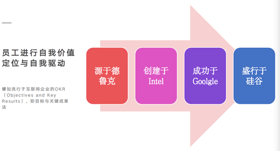 第一,自主管理和績(jī)效管理相結(jié)合,也就是OKR的概念,強(qiáng)調(diào)自我價(jià)值驅(qū)動(dòng)、自我定位。OKR的基本理念是:組織基于大概的方向,確定一個(gè)總目標(biāo),每一個(gè)團(tuán)隊(duì)、每一個(gè)個(gè)體基于對(duì)總目標(biāo)的理解提出自己的目標(biāo)貢獻(xiàn)。當(dāng)然有一套評(píng)價(jià)標(biāo)準(zhǔn),如打分是0—1分之間,那么得分在0.6—0.7之間相對(duì)合適。也就是說,OKR的計(jì)量標(biāo)準(zhǔn)不一定是要員工百分之百完成績(jī)效指標(biāo),而是關(guān)注你如何做到對(duì)目標(biāo)實(shí)現(xiàn)更有貢獻(xiàn)度。本質(zhì)上是評(píng)價(jià)員工對(duì)目標(biāo)實(shí)現(xiàn)的影響,而不是必須完成的指標(biāo)值。
