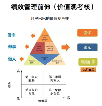 第二,績(jī)效管理向前延伸。代表性案例是阿里巴巴的價(jià)值觀管理、華為的勞動(dòng)態(tài)度考核等。通過把績(jī)效管理向前延伸,通過考核價(jià)值觀實(shí)現(xiàn)選拔、引導(dǎo)和調(diào)動(dòng)員工實(shí)現(xiàn)組織期望的績(jī)效。
