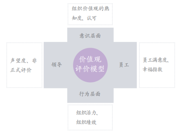 前面提到,組織的價(jià)值觀需要傳播,也就是通過(guò)培訓(xùn)與企業(yè)文化氛圍的營(yíng)造來(lái)向員工傳遞企業(yè)的價(jià)值觀。所以從員工的意識(shí)層面建立評(píng)價(jià)指標(biāo),例如員工對(duì)組織價(jià)值觀的熟知度、員工對(duì)組織價(jià)值觀的認(rèn)可度來(lái)進(jìn)行評(píng)價(jià),旨在從員工意識(shí)層面得出員工對(duì)企業(yè)的價(jià)值觀是否理解、是否認(rèn)同及認(rèn)同度如何。
